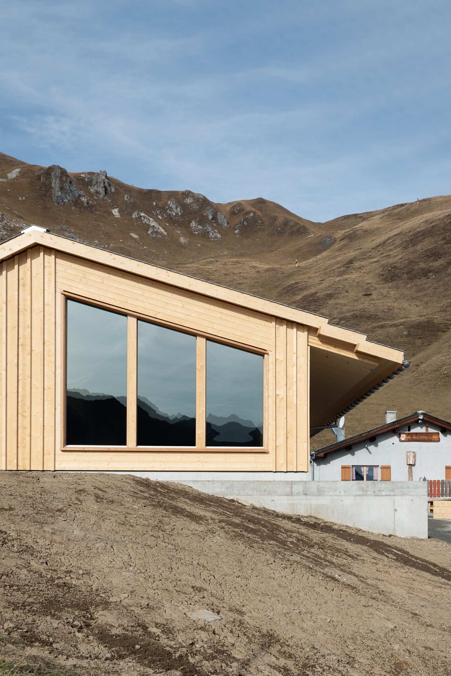 Im zweigeschossigen Teil des Neubaus sind die Wohnräume für das Alppersonal untergebracht.